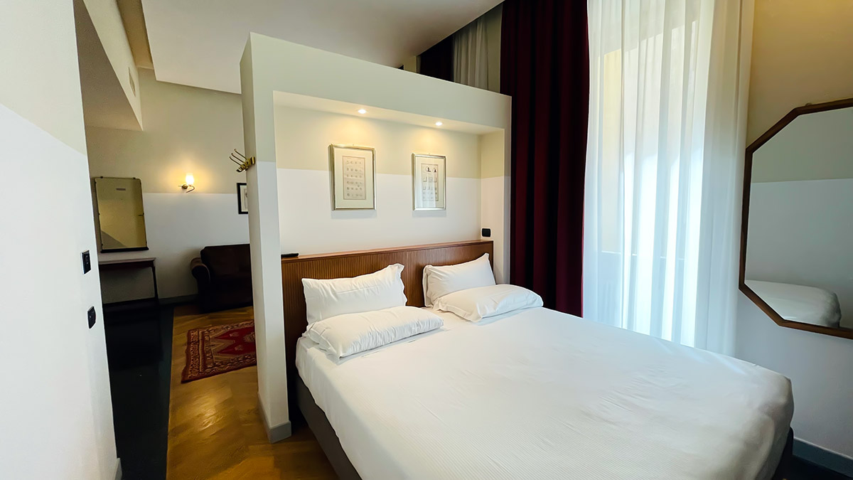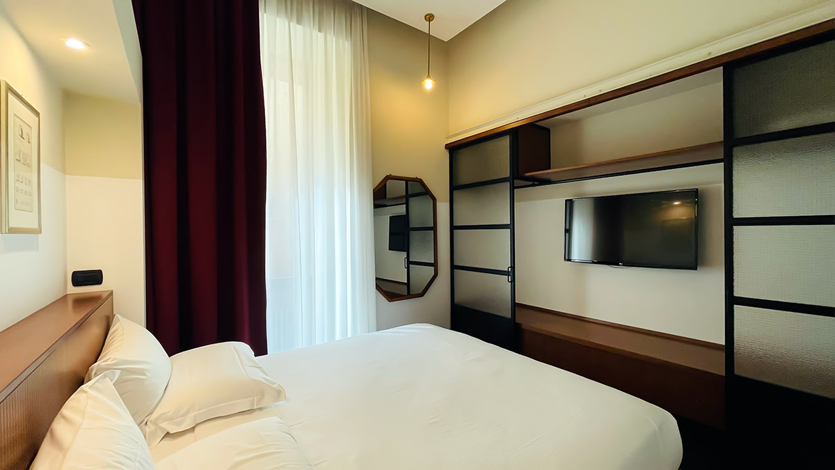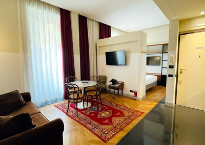 Si tratta di una soluzione accogliente indicata per un soggiorno breve o medio. Ideale per una coppia o famiglie. 50 metri quadri di superficie, con affaccio esterno ed interno, con pavimenti in marmette o parquet. Una zona giorno con una cucina completa, tavolo da pranzo e salottino con divano letto e TV. La zona letto è separata, dotata di letto matrimoniale king-size e TV. Il bagno, con ampio piatto doccia in marmo o vasca è dotato di un set di servizio completo.